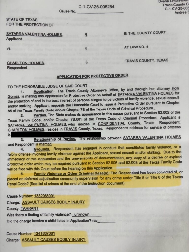 Then came another revelation: the relationship itself was built on a lie. Holmes learned that throughout their entire time together, Satarra was legally married to another man. Their November 2023 “marriage” in Travis County was void from the start under Texas law due to bigamy.