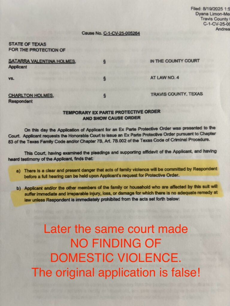 As of fall 2025, Holmes is still untangling the fallout. He has filed sworn statements correcting police errors, petitioned courts for protective measures for his son, and worked to rectify inaccurate records. But he is still waiting for institutional accountability—from APD, from the Travis County Attorney’s Office, and from every entity that acted decisively on unverified claims while ignoring documented truth.